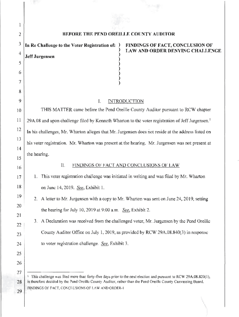 BEFORE THE PEND ORVILLE COUNTY AUDITOR23 In Re Challenge to the Voter Registration of:) 4))))))))Jeff Jurgensen5 6 7FINDINGS OF FACT, CONCLUSION OF LAW AND ORDER DENYING CHALLENGE8 9I.INTRODUCTION10THIS