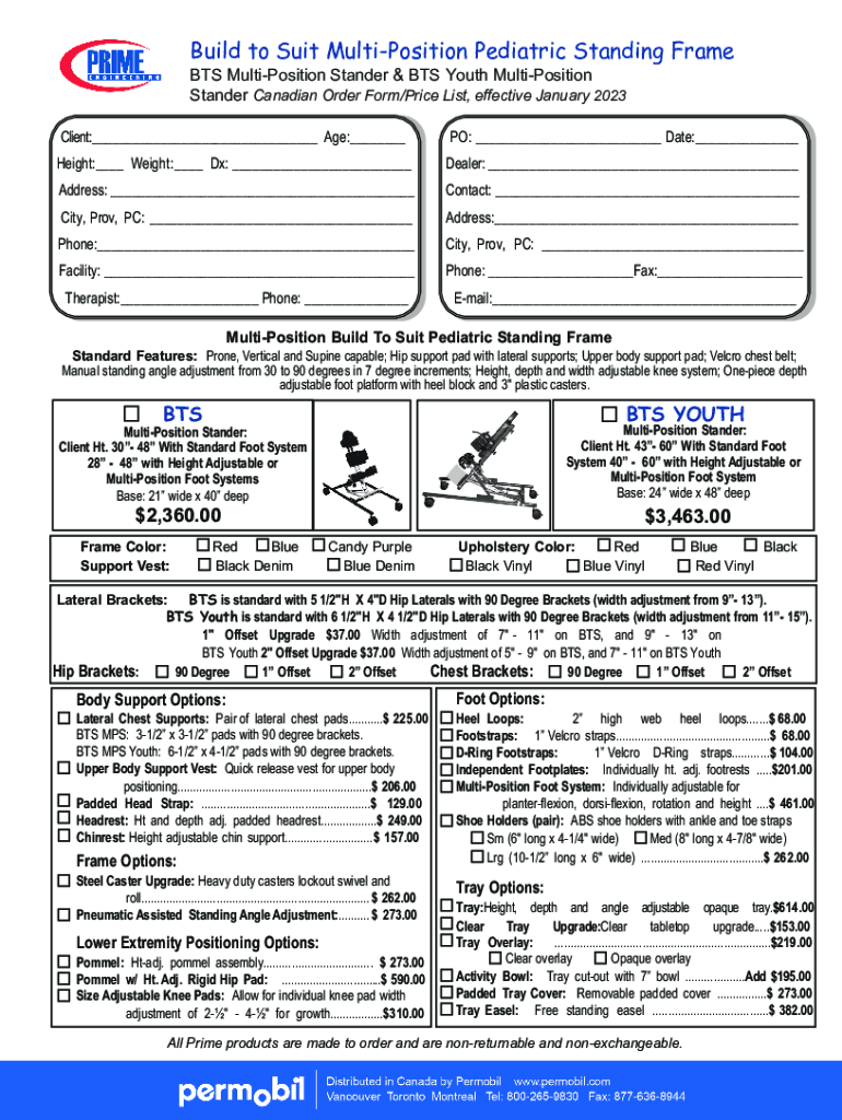 Build to Suit Juxtaposition Pediatric Standing Frame BTS Juxtaposition Stander & BTS Youth Juxtaposition Stander Canadian Order Form/Price List, effective January 2023 Client:___ Age:___Height:___