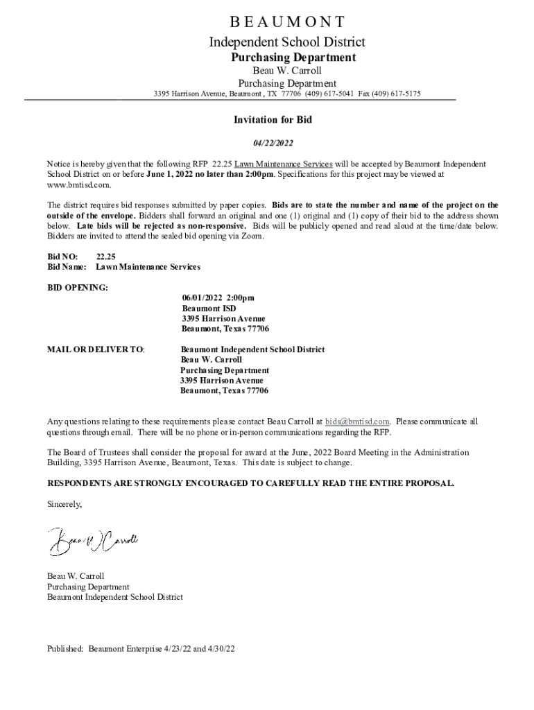 Purchasing Department3395 Harrison Avenue, Beaumont, TX 77706 (409) 6175041 Fax (409) 6175175Invitation for Bid