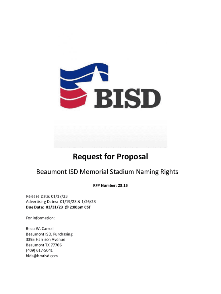 Request for Proposal Beaumont ISD Memorial Stadium Naming Rights RFP Number: 23.15 Release Date: 01/17/23 Advertising Dates: 01/19/23 & 1/26/23 Due Date: 03/31/23 @ 2:00pm CST For information: Beau