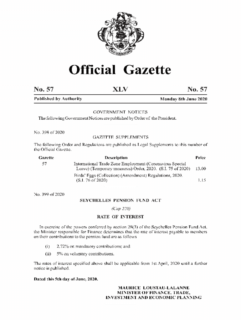 Official Gazette Leno. 57 Published by Authority No. 57 Monday 8th June 2020GOVERNMENT NOTICES The following Government Notices are published by Order of the President. No. 398 of 2020GAZETTE SUPPLEMENTS