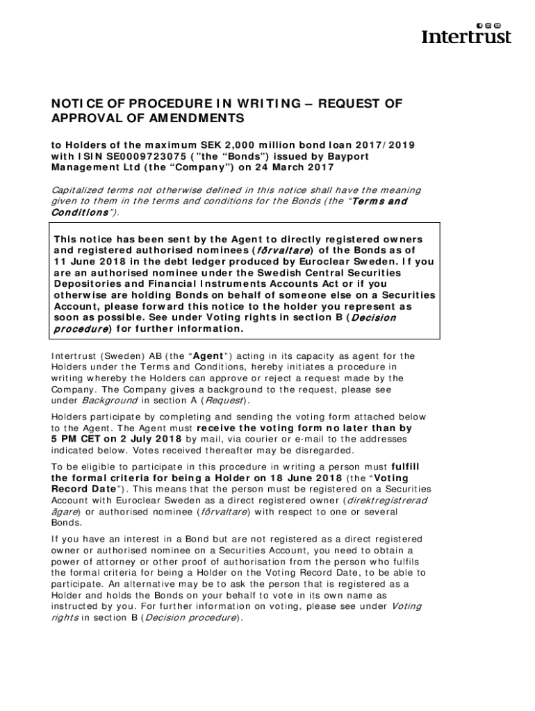 NOTICE OF PROCEDURE IN WRITING REQUEST OF APPROVAL OF AMENDMENTS to Holders of the maximum SEK 2,000 million bond loan 2017/2019 with ISIN SE0009723075 (the Bonds) issued by Bay port Management Ltd
