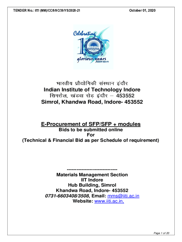 TENDER No.: IIT (MM)/CC/9/9C/39/IS/202021October 01, 2020Indian Institute of Technology Indore 453552 Symbol, Chandra Road, Indore 453552EProcurement of SFP/SFP + modules Bids to be submitted online