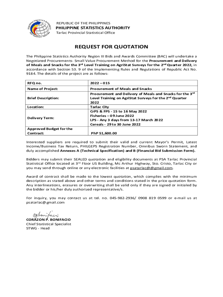 REPUBLIC OF THE PHILIPPINESPHILIPPINE STATISTICS AUTHORITY Tarmac Provincial Statistical OfficeREQUEST FOR QUOTATION The Philippine Statistics Authority Region III Bids and Awards Committee (BAC)