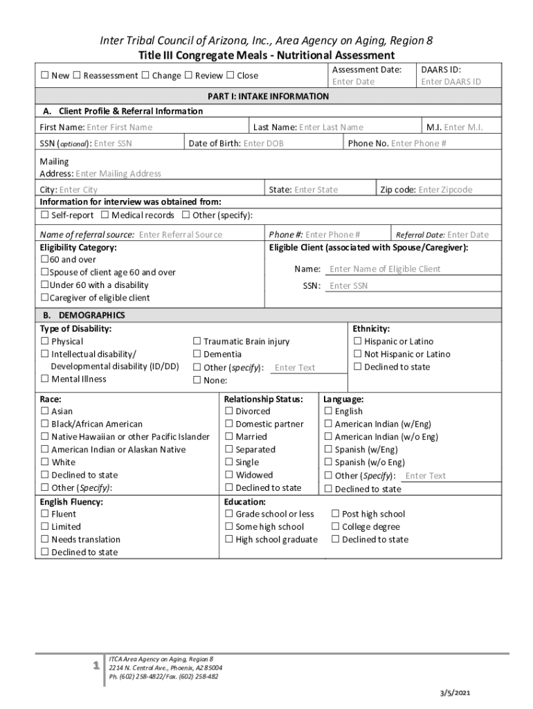 Inter Tribal Council of Arizona, Inc., Area Agency on Aging, Region 8 Title III Congregate Meals Nutritional Assessment Date: Enter Date New Reassessment Change Review CloseDAARS ID: Enter DEARS IMPART