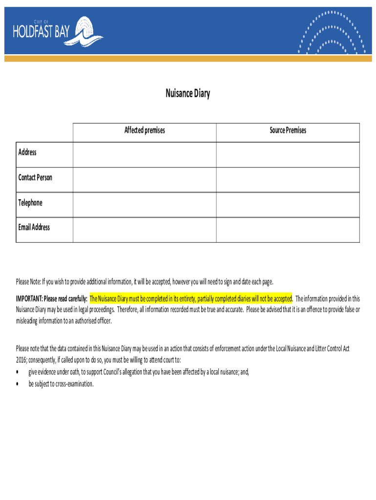 Nuisance Diary Affected premisesSource PremisesAddress Contact Person Telephone Email AddressPlease Note: If you wish to provide additional information, it will be accepted, however you will need