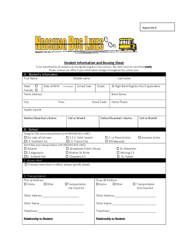 Appendix Student Information and Bussing Sheet To be submitted by all students accessing Noising Bus Lines services. Bus form must be submitted yearly. Please contact our office if your information
