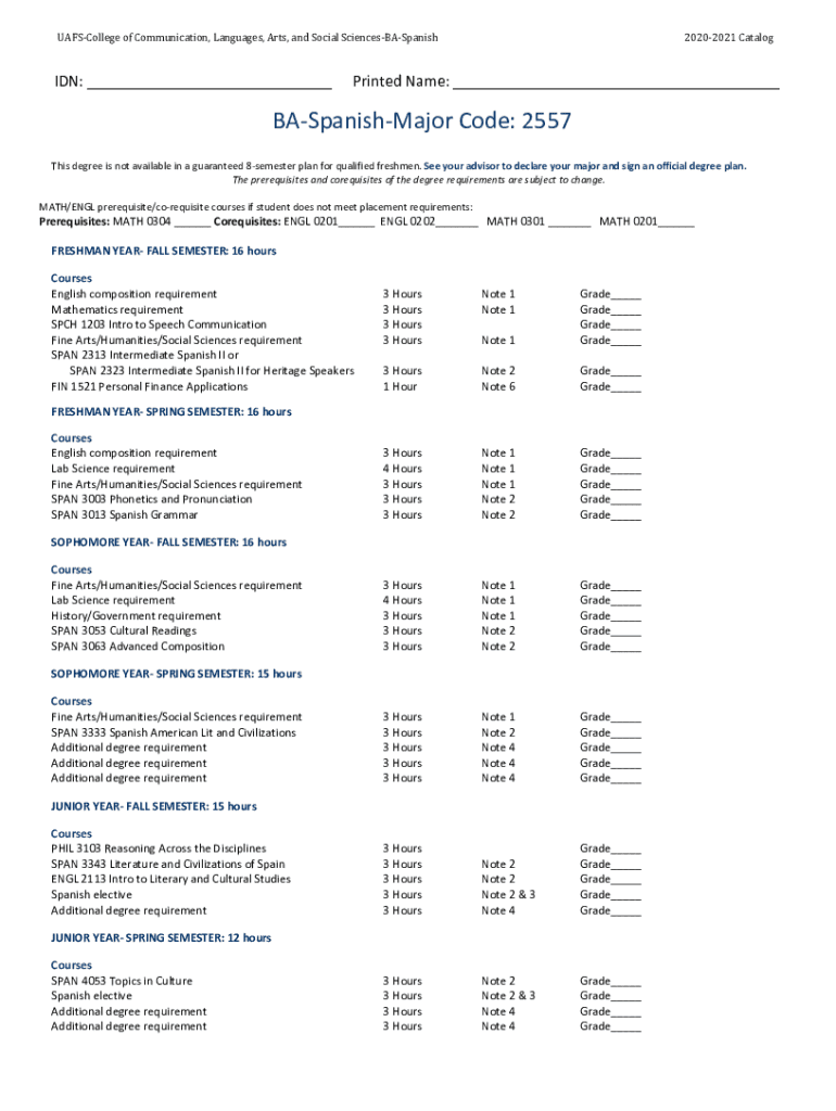 UAFSCollege of Communication, Languages, Arts, and Social SciencesBASpanishIDN: ___20202021 CatalogPrinted Name: ___BASpanishMajor Code: 2557 This degree is not available in a guaranteed 8semester