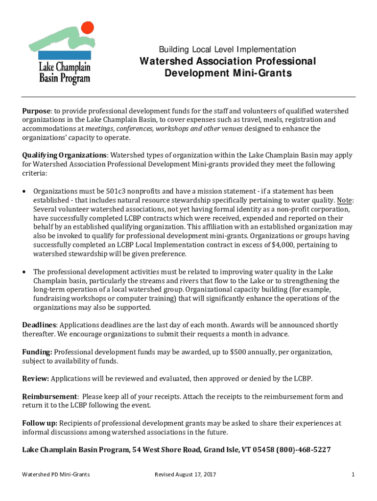 Building Local Level ImplementationWatershed Association Professional Development MiniGrantsPurpose:toprovideprofessionaldevelopmentfundsforthestaffandvolunteersofqualifiedwatershed organizationsintheLakeChamplainBasin,