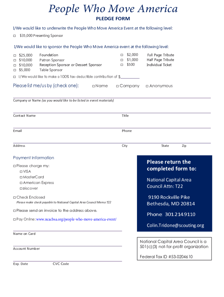 People Who Move America PLEDGE FORM I/We would like to underwrite the People Who Move America Event at the following level: $35,000 Presenting Sponsor/We would like to sponsor the People Who Move