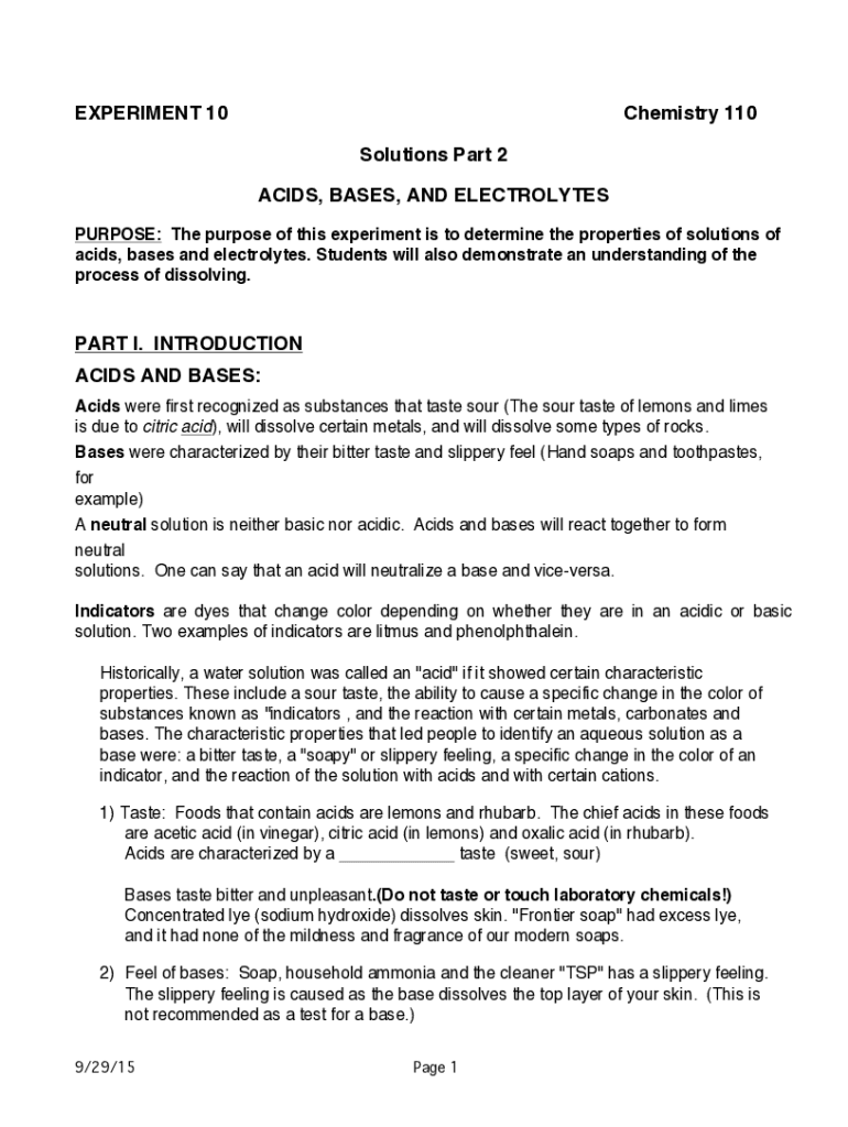 EXPERIMENT 10Chemistry 110 Solutions Part 2 ACIDS, BASES, AND ELECTROLYTESPURPOSE: The purpose of this experiment is to determine the properties of solutions of acids, bases and electrolytes. Students
