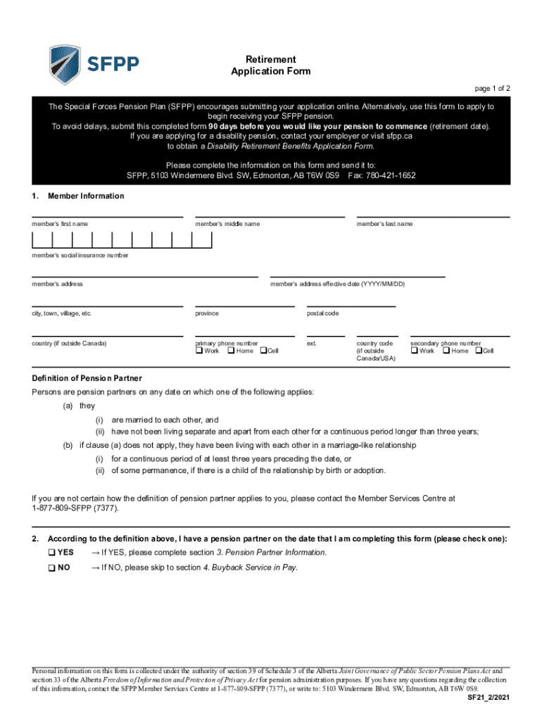 Retirement Application Form page 1 of 2The Special Forces Pension Plan (SUPP) encourages submitting your application online. Alternatively, use this form to apply to begin receiving your SUPP pension.