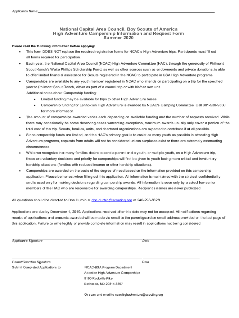 Applicant\'s Name:National Capital Area Council, Boy Scouts of America High Adventure Camper ship Information and Request Form Summer 2020 Please read the following information before applying:This