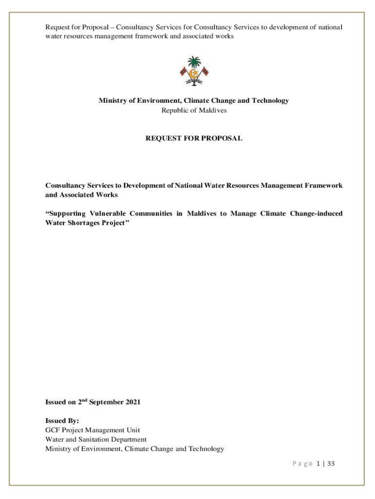 Request for Proposal Consultancy Services for Consultancy Services to development of national water resources management framework and associated worksMinistry of Environment, Climate Change and Technology