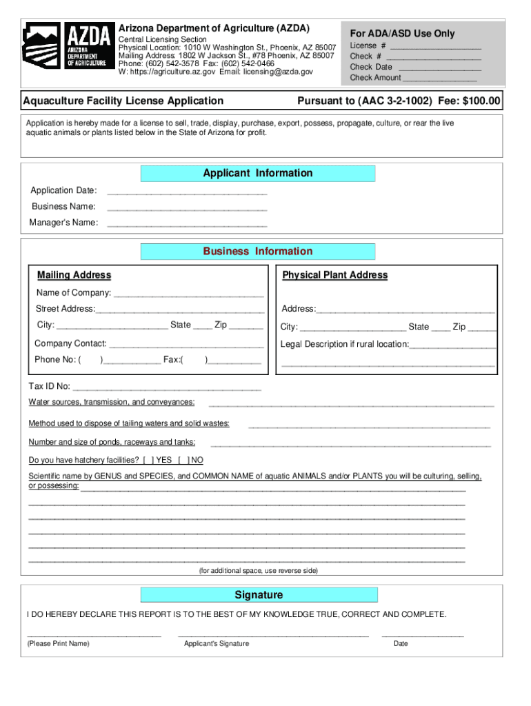 Arizona Department of Agriculture (ADA) Central Licensing Section Physical Location: 1010 W Washington St., Phoenix, AZ 85007 Mailing Address: 1802 W Jackson St., #78 Phoenix, AZ 85007 Phone: (602)