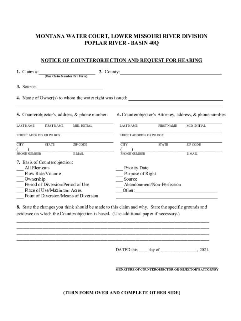 MONTANA WATER COURT, LOWER MISSOURI RIVER DIVISION POPLAR RIVER BASIN 40Q NOTICE OF COUNTEROBJECTION AND REQUEST FOR HEARING 1. Claim #:___ 2. County:___ (One Claim Number Per Form)3. Source:___ 4.