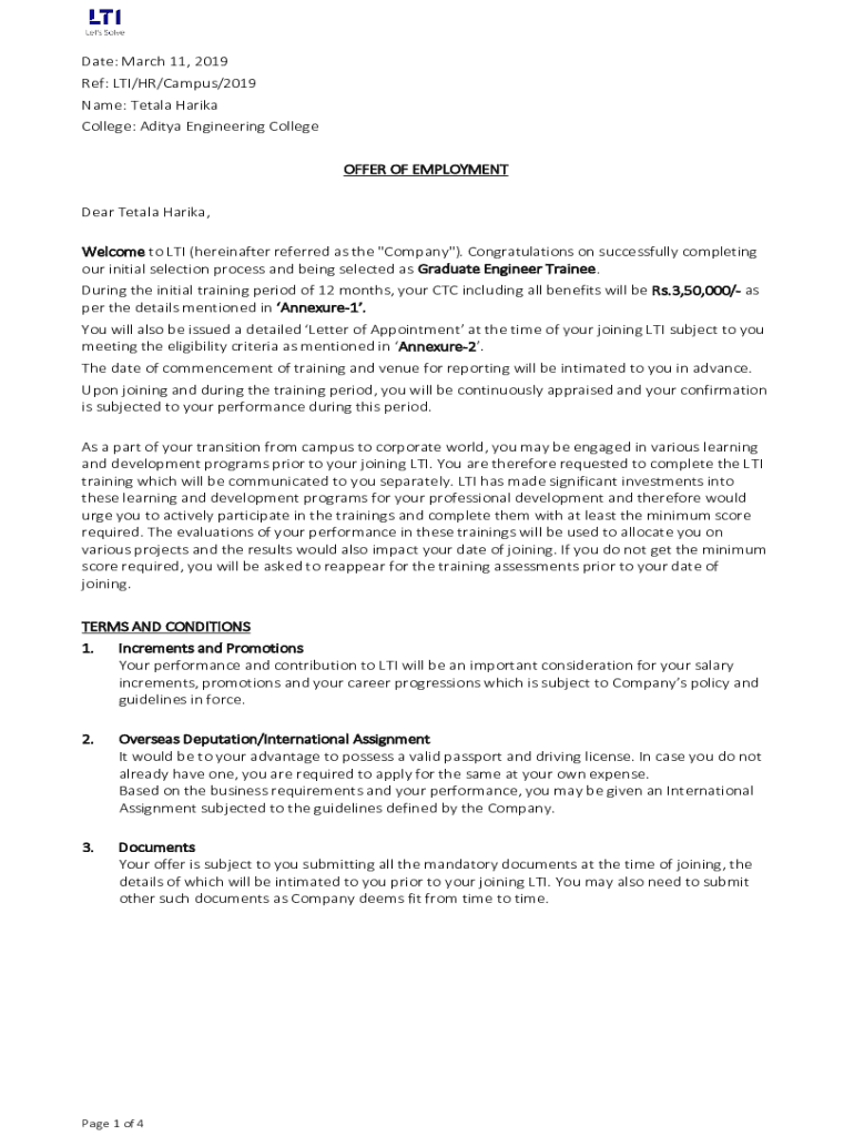 Date: March 11, 2019, Ref: LTI/HR/Campus/2019 Name: Total Maria College: Aditya Engineering College OFFER OF EMPLOYMENT Dear Total Maria, Welcome to LTI (hereinafter referred as the \” Company\”).