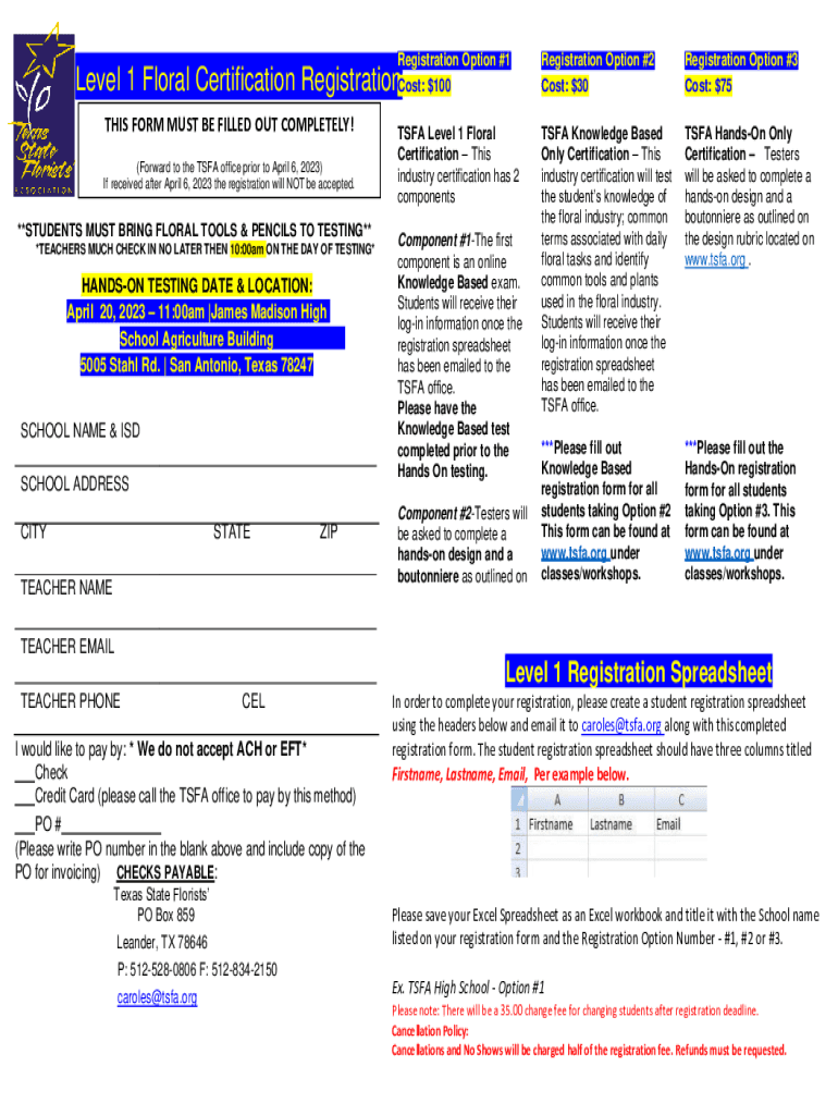 Registration Option #1Registration Option #2 Cost: $30Registration Option #3 Cost: $75TSFA Level 1 Floral Certification This industry certification has 2 componentsTSFA Knowledge Based Only Certification