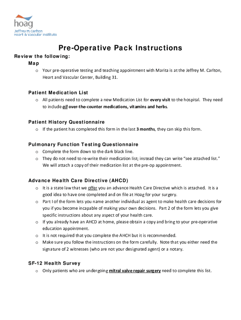 Preoperative Pack Instructions Review the following: Map o Your preoperative testing and teaching appointment with Marita is at the Jeffrey M. Carlton, Heart and Vascular Center, Building 31. Patient