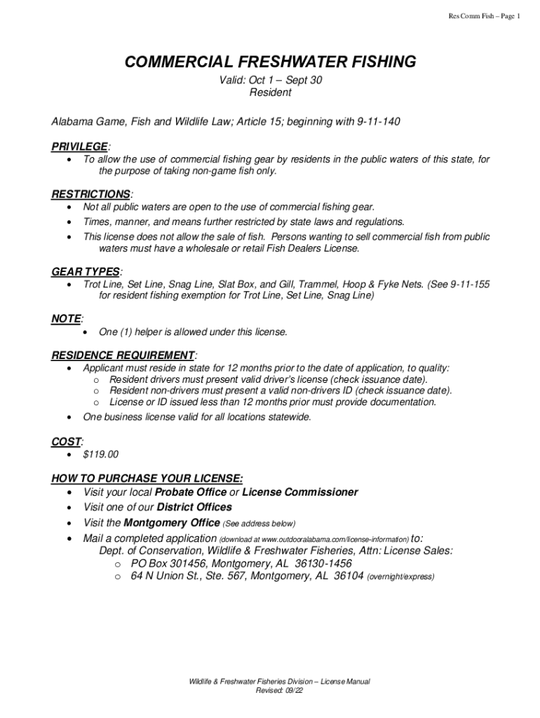 Res Comm Fish Page 1COMMERCIAL FRESHWATER FISHING Valid: Oct 1 Sept 30 Resident Alabama Game, Fish and Wildlife Law; Article 15; beginning with 911140 PRIVILEGE: To allow the use of commercial fishing