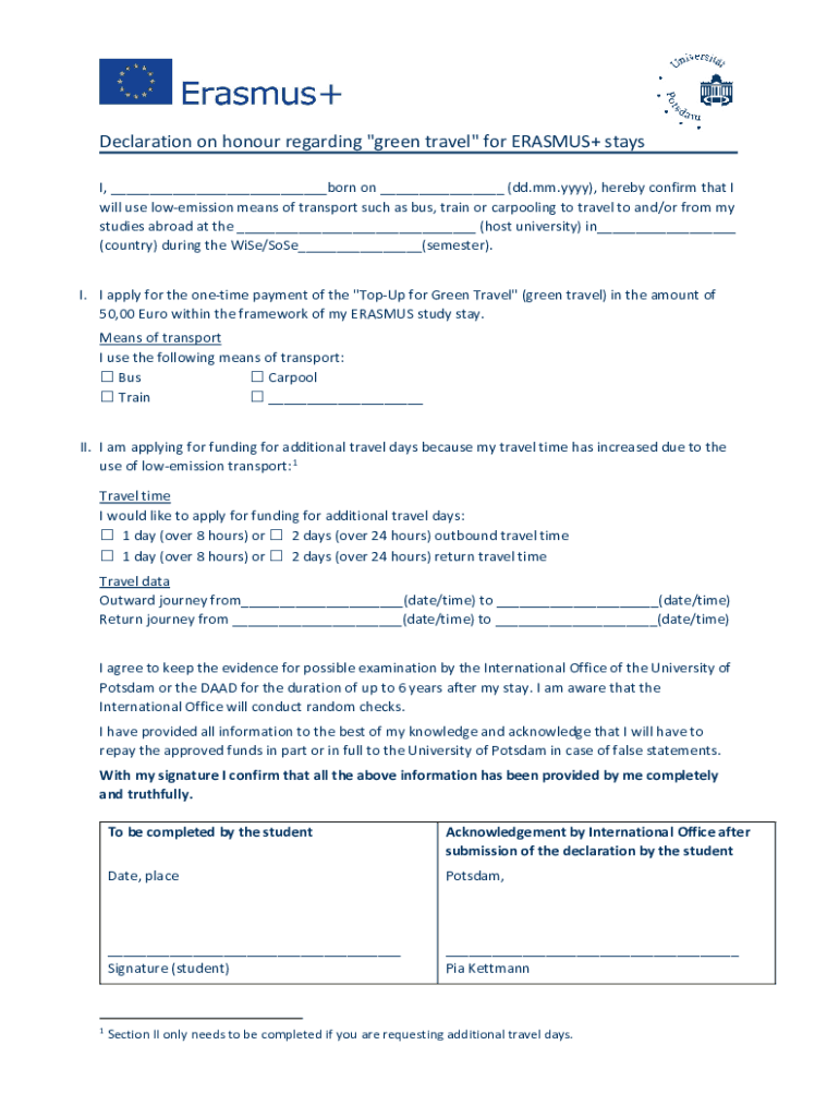 Declaration on honor regarding \” green travel\” for ERASMUS+ stays I, ___born on ___ (dd.mm.YYY), hereby confirm that I will use low emission means of transport such as bus, train or carpooling