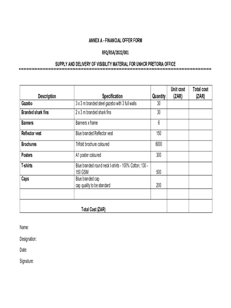 ANNEX A FINANCIAL OFFER FORM/RSA/2022/001 SUPPLY AND DELIVERY OF VISIBILITY MATERIAL FOR UNHCR PRETORIA OFFICEDescriptionSpecificationQuantityGazebo3 x 3 m branded steel gazebo with 3 full walls30Branded
