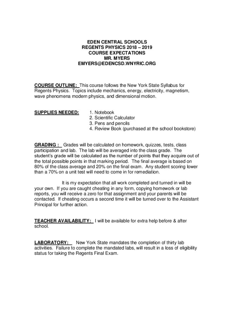 EDEN CENTRAL SCHOOLS REGENTS PHYSICS 2018 2019 COURSE EXPECTATIONS MR. MYERS EMYERS@EDENCSD.WNYRIC.ORGCOURSE OUTLINE: This course follows the New York State Syllabus for Regents Physics. Topics include