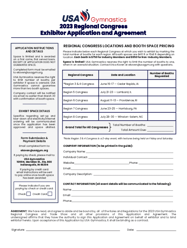 2023 Regional Congress Exhibitor Application and Agreement APPLICATION INSTRUCTIONS AND DETAILS Space is limited and is awarded on a first come, first served basis. RECEIPT OF APPLICATION DOES NOT