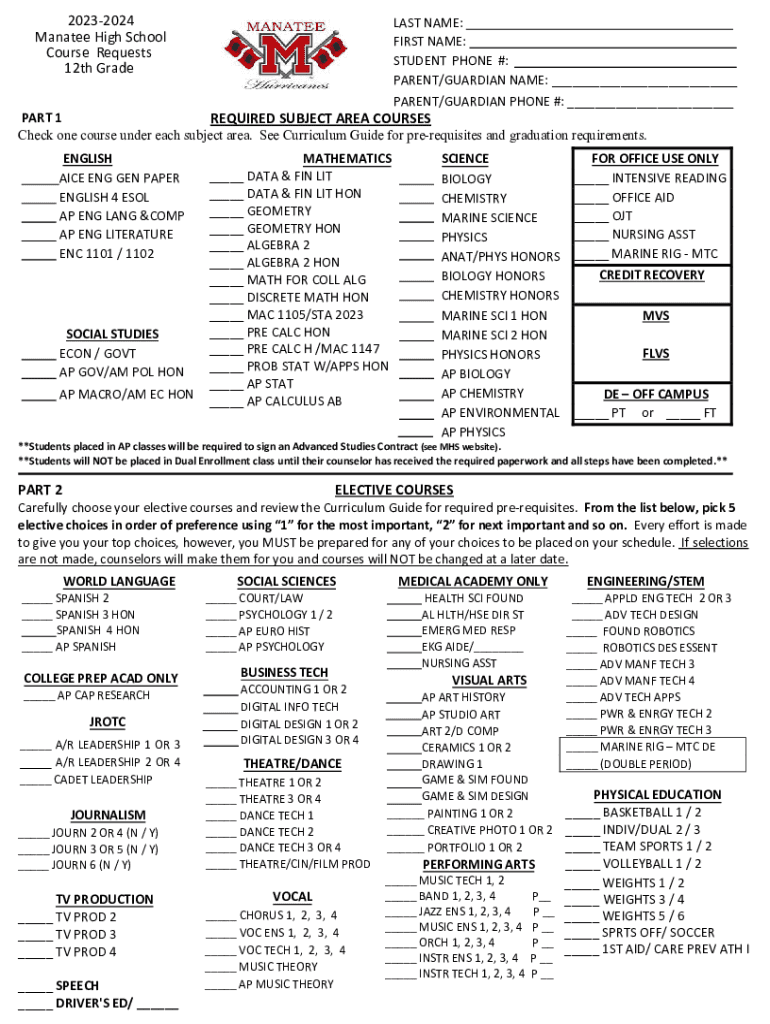 20232024 Manatee High School Course Requests 12th Grades NAME: FIRST NAME: STUDENT PHONE #: PARENT/GUARDIAN NAME: ___ PARENT/GUARDIAN PHONE #: ___PART 1 REQUIRED SUBJECT AREA COURSES Check one course