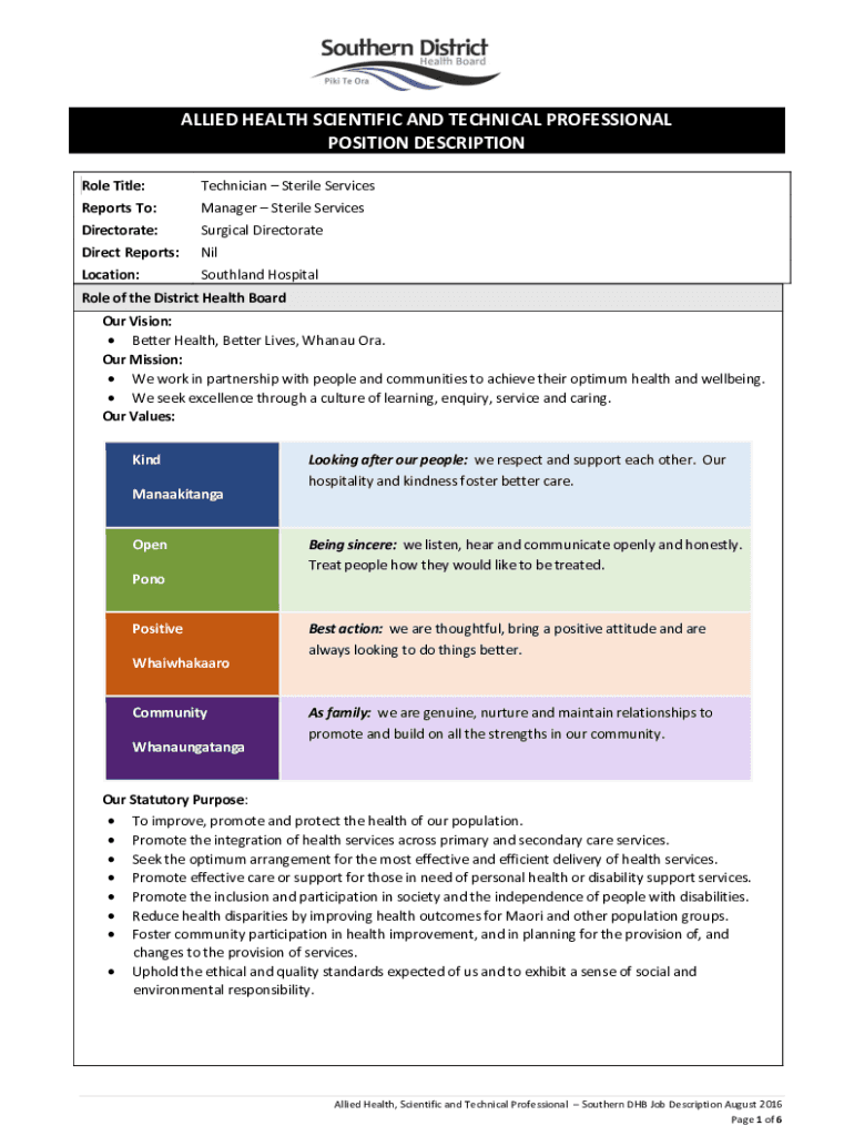 ALLIED HEALTH SCIENTIFIC AND TECHNICAL PROFESSIONAL POSITION DESCRIPTION Role Title: Reports To: Directorate: Direct Reports: Location:Technician Sterile Services Manager Sterile Services Surgical