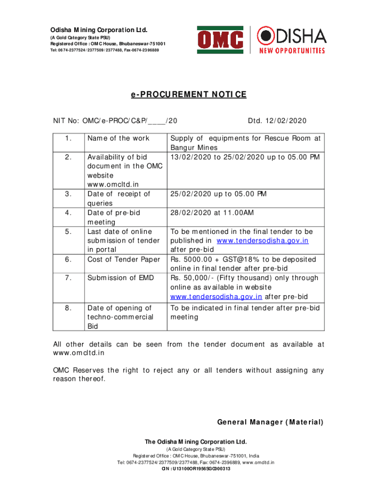Odisha Mining Corporation Ltd. (A Gold Category State PSU) Registered Office : OMC House, Bhubaneswar751001 Tel: 06742377524/2377509/2377488, Fax06742396889ePROCUREMENT NOTICE NIT No: OMC/EPROM/C&P/___/20