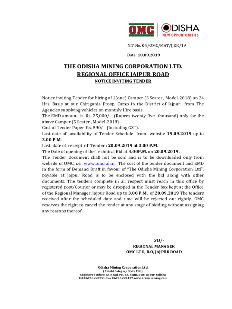 NOTICE INVITING TENDERNotice inviting Tender for hiring of 1(one) Camper (5 Seaters, Model2018)