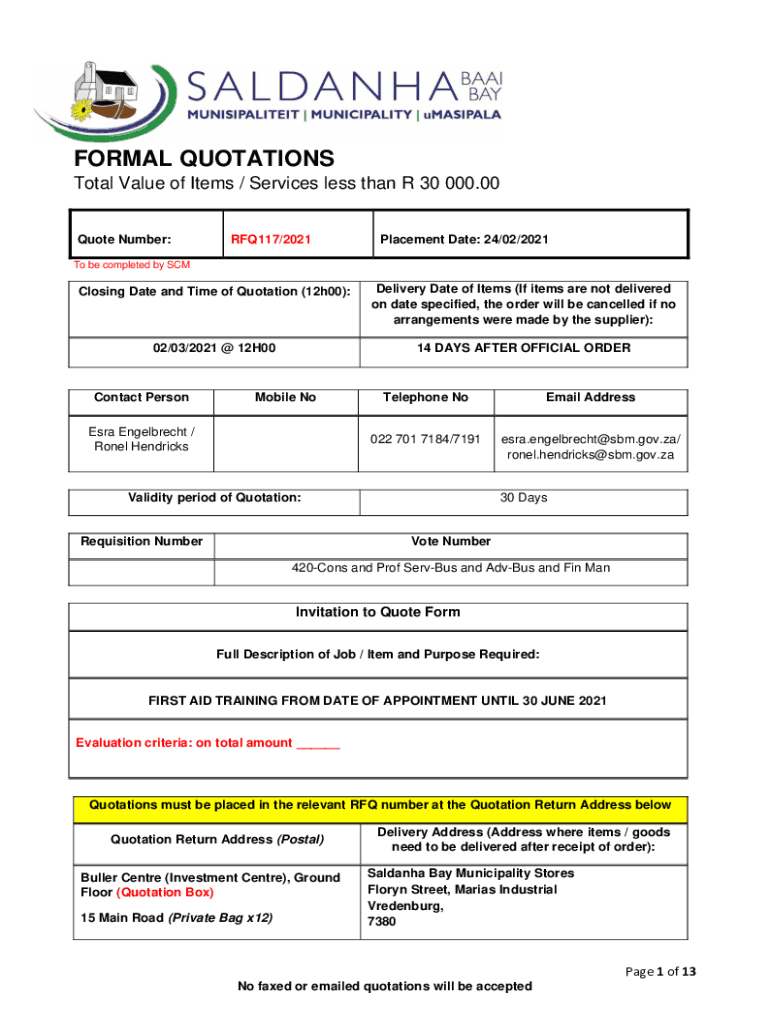 Quote Number:RFQ117/2021Placement Date: 24/02/2021To be completed by Closing Date and Time of Quotation (12h00):Delivery Date