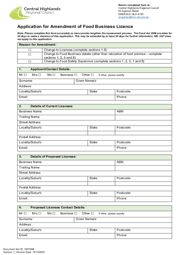 Return completed form to: Central Highlands Regional Council 65 Edgerton Street EMERALD QLD 4720 enquiries@chrc.qld.gov.auApplication for Amendment of Food Business License Note: Please complete this