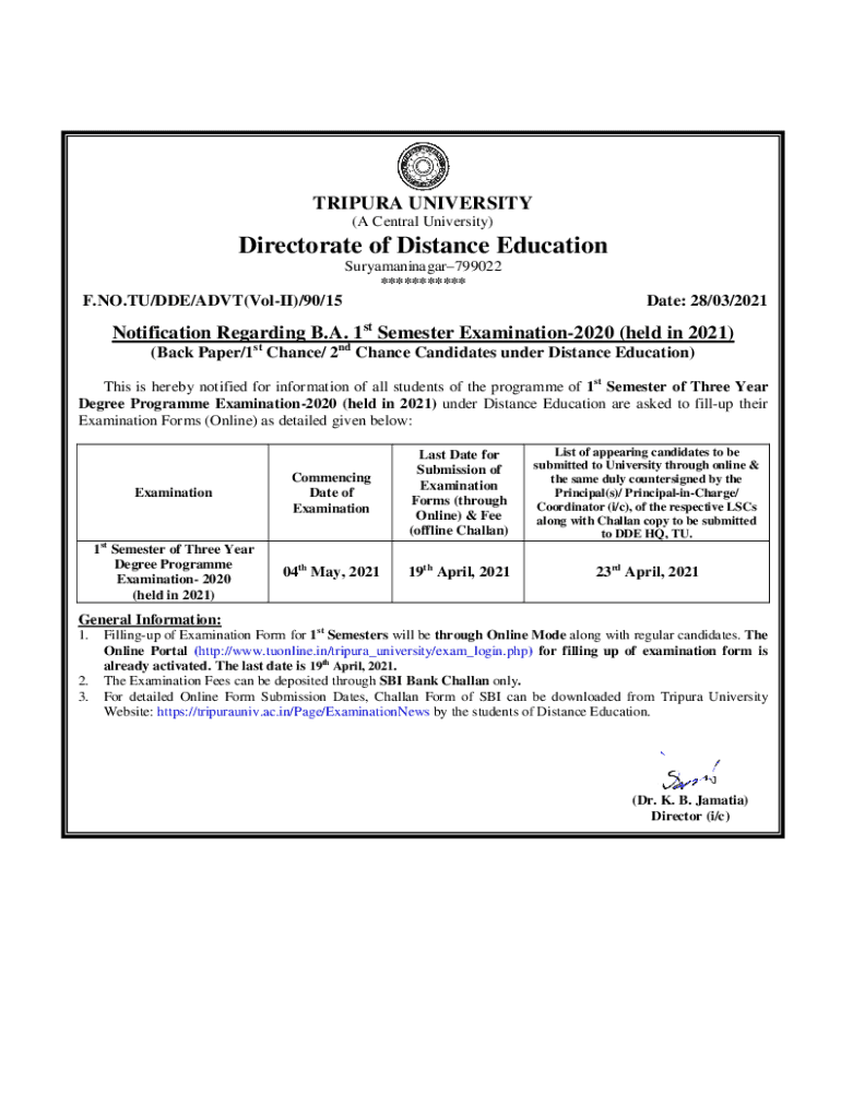 TRIPURA UNIVERSITY (A Central University)Directorate of Distance Education Suryamaninagar799022 ***********F.NO.TU/DDE/ADVT(VolII)/90/15Date: 28/03/2021Notification Regarding B.A. 1st Semester Examination2020
