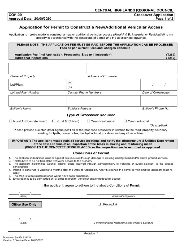 CENTRAL HIGHLANDS REGIONAL COUNCIL Crossover ApplicationCOF09 Approval Date: 20/05/2020Page 1 of 2Application for Permit to Construct a New/Additional Vehicular Access Application is hereby made to