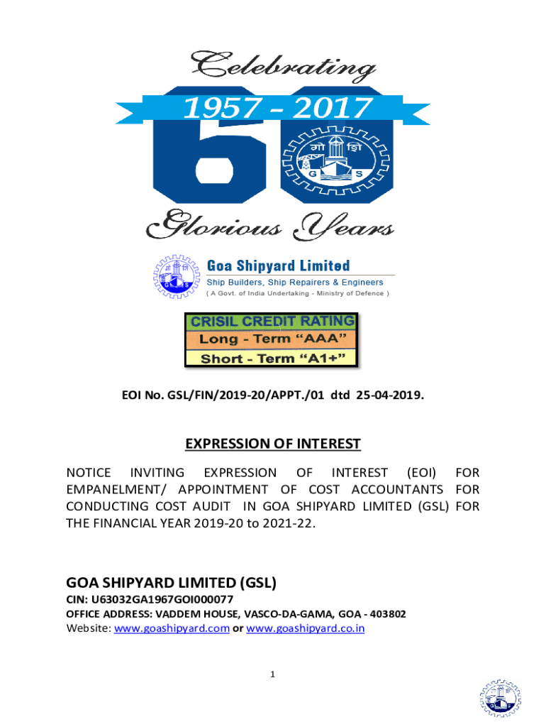 EOI No. GSL/FIN/201920/APT./01 did 25042019.EXPRESSION OF INTEREST NOTICE INVITING EXPRESSION OF INTEREST (EOI) FOR EMBANKMENT/ APPOINTMENT OF COST ACCOUNTANTS FOR CONDUCTING COST AUDIT IN GOA SHIPYARD