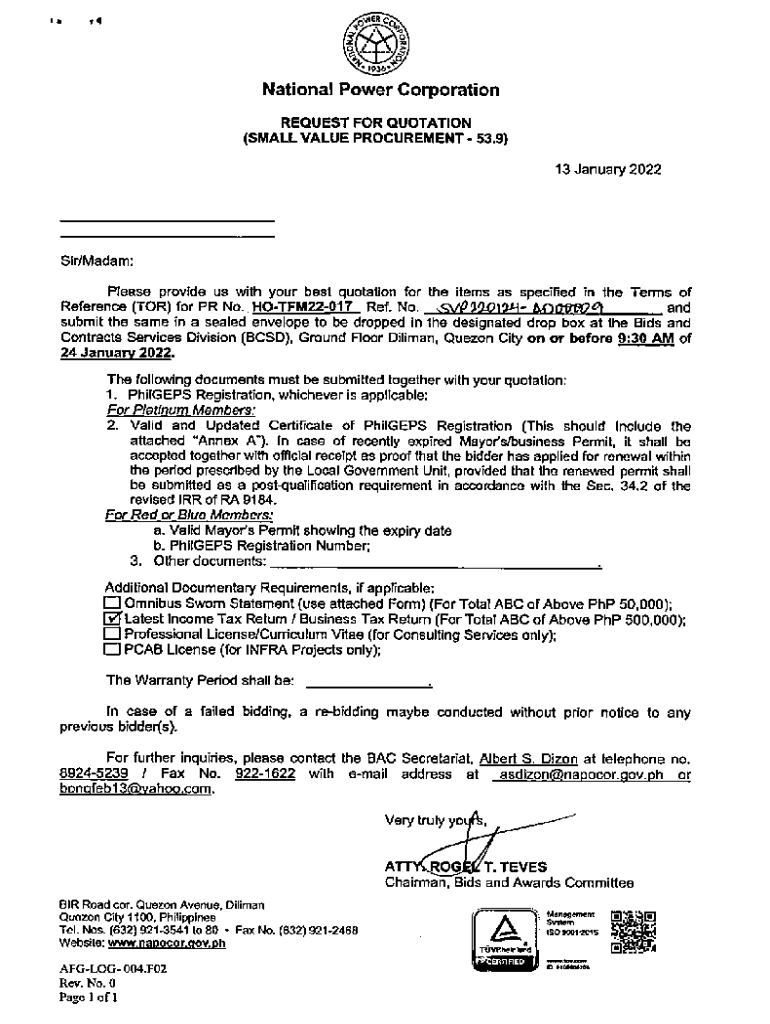 National Power Corporation REQUEST FOR QUOTATION (SMALL VALUE PROCUREMENT 53.9) 13 January 2022Sir/Madam; Please provide us with your best quotation for the items as specified In the Terms of Reference