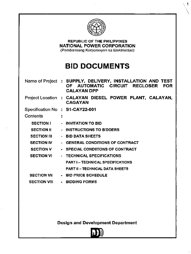 (Pambansang Corporation SA Elektrisidad)BID DOCUMENTS