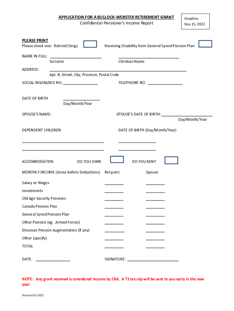 APPLICATION FOR A BULLOCKWEBSTER RETIREMENT GRANT