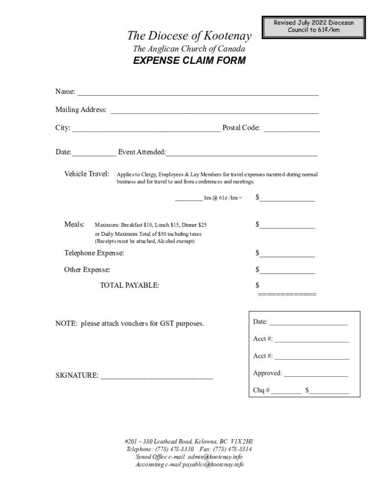 The Diocese of Kootenai The Anglican Church of CanadaEXPENSE CLAIM FORM Name: ___ Mailing Address: ___ City: ___ Postal Code: ___ Date:___ Event Attended:___ Vehicle Travel:Applies to Clergy, Employees