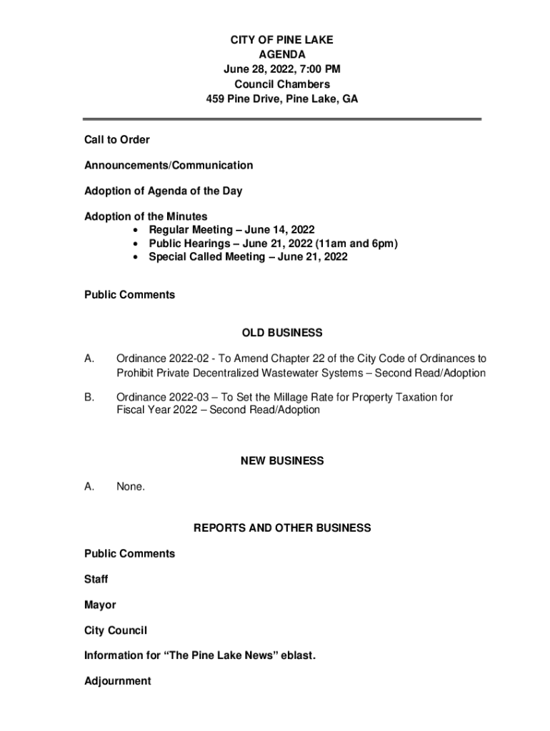 CITY OF PINE LAKE AGENDA June 28, 2022, 7:00 PM Council Chambers 459 Pine Drive, Pine Lake, Bacall to Order Announcements/Communication Adoption of Agenda of the Day Adoption of the Minutes Regular