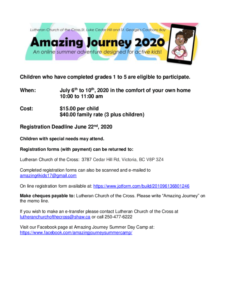 Children who have completed grades 1 to 5 are eligible to participate. When:July 6th to 10th, 2020 in the comfort of your own home 10:00 to 11:00 accost:$15.00 per child $40.00 family rate (3 plus