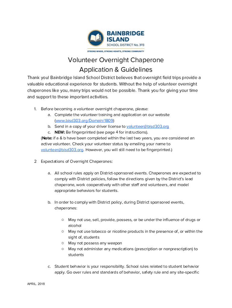Volunteer Overnight Chaperone Application & Guidelines, Thank you! Bainbridge Island School District believes that overnight field trips provide a valuable educational experience for students. Without