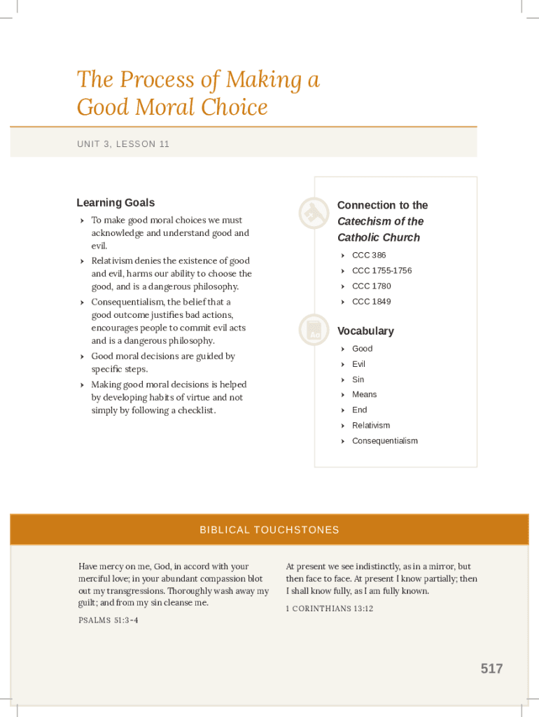 The Process of Making a Good Moral Choice UNIT 3, LESSON 11Learning Goals To make good moral choices we must acknowledge and understand good and evil. Connection to the Catechism of the Catholic Church
