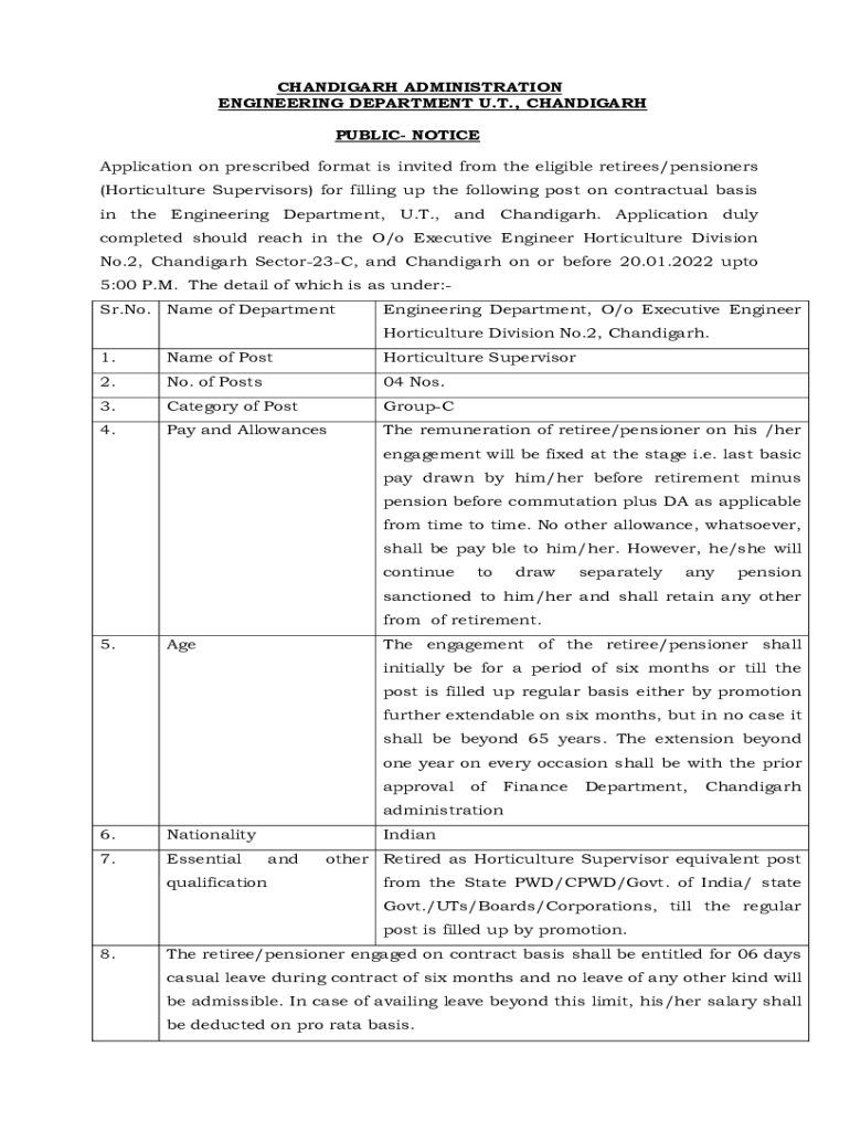 CHANDIGARH ADMINISTRATION ENGINEERING DEPARTMENT U.T., CHANDIGARH PUBLIC NOTICE Application on prescribed format is invited from the eligible retirees/pensioners (Horticulture Supervisors) for filling