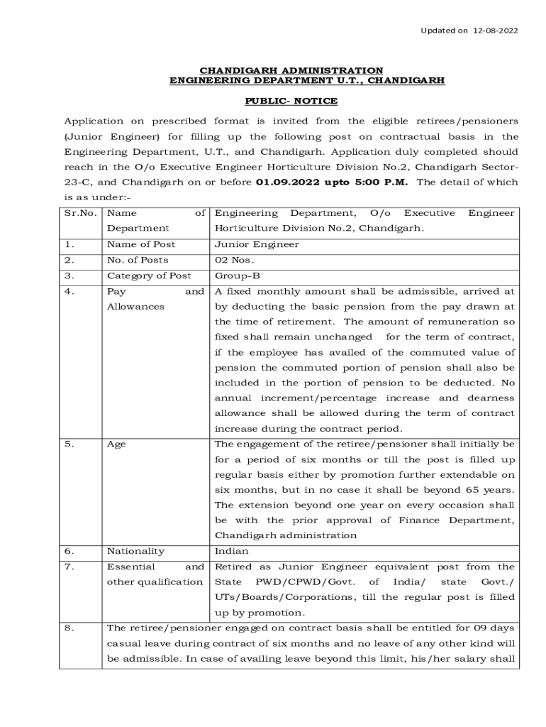 Updated on 12082022CHANDIGARH ADMINISTRATION ENGINEERING DEPARTMENT U.T., CHANDIGARH PUBLIC NOTICE Application on prescribed format is invited from the eligible retirees/pensioners (Junior Engineer)