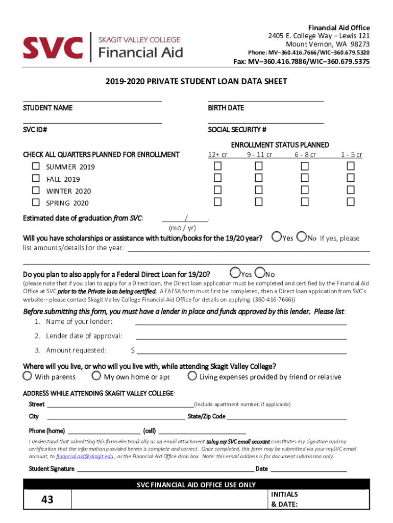 Financial Aid Office 2405 E. College Way Lewis 121 Mount Vernon, WA 98273 Phone: MV360.416.7666/WIC360.679.5320Fax: MV360.416.7886/WIC360.679.537520192020 PRIVATE STUDENT LOAN DATA SHEET STUDENT REBIRTH