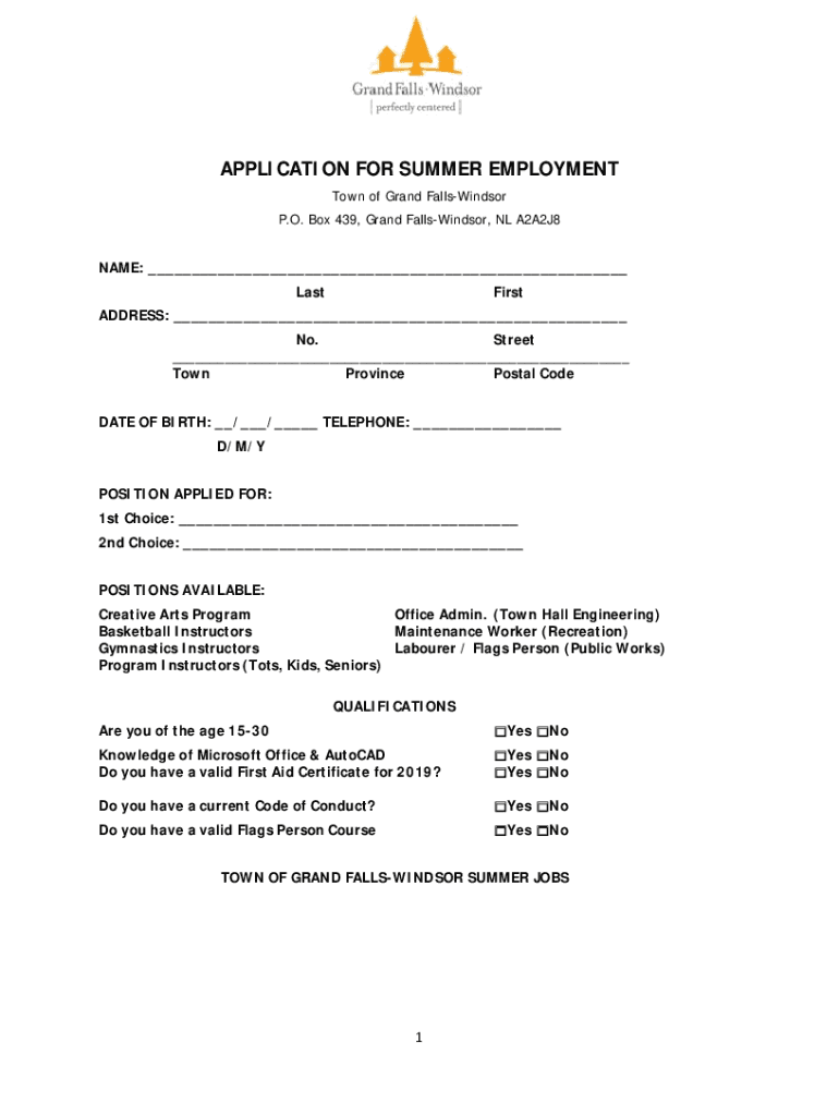 APPLICATION FOR SUMMER EMPLOYMENT Town of Grand Falls Windsor P.O. Box 439, Grand Falls Windsor, NL A2A2J8 NAME: ___ LastFirstADDRESS: ___ No. Street ___ Town Province Postal Code DATE OF BIRTH: __/___/___