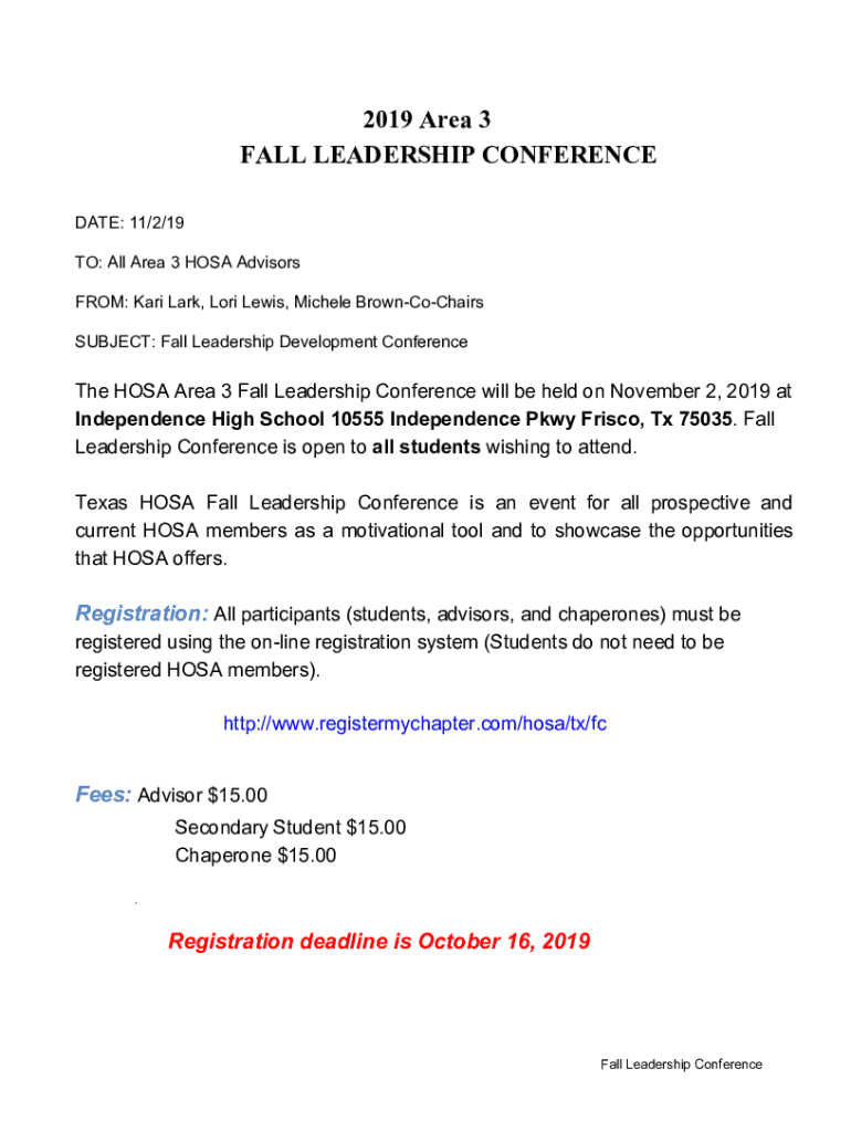 2019 Area 3 FALL LEADERSHIP CONFERENCE DATE: 11/2/19 TO: All Area 3 HOST Advisors FROM: Kari Lark, Lori Lewis, Michele BrownCoChairs SUBJECT: Fall Leadership Development Conference HOST Area 3 Fall